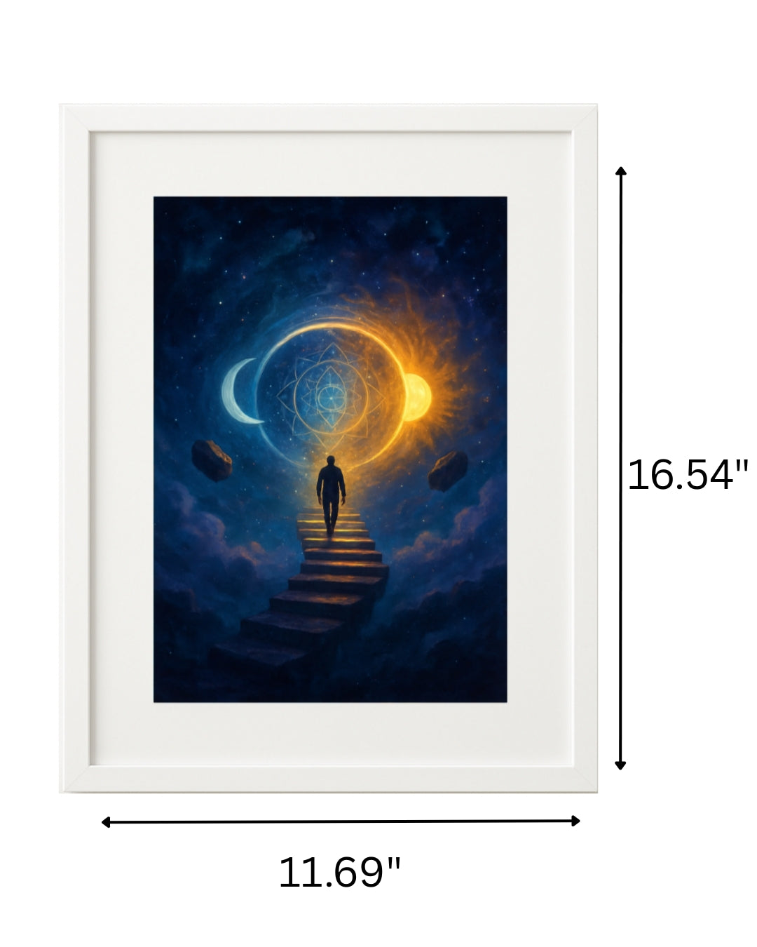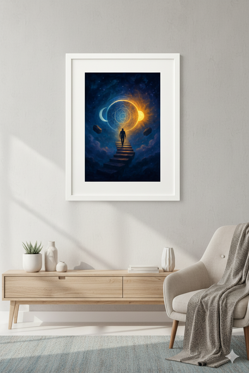 A dreamy, symbolic artwork representing the journey of the soul through infinite dimensions. The stairway merges with the cosmos, blending reality and imagination in perfect flow. Ideal for dreamers, thinkers, and seekers who believe in the beauty of the unknown.