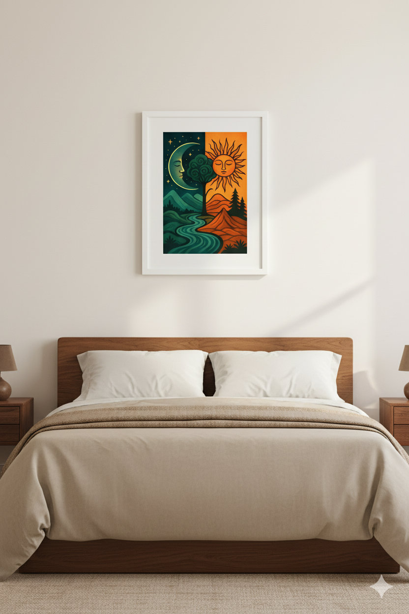 Representing the eternal dance of day and night, this poster unites the Sun and Moon in a harmonious design. The golden warmth and cool blue tones create balance, reminding us of life’s constant cycles. A beautiful addition for anyone who values peace and perspective.
